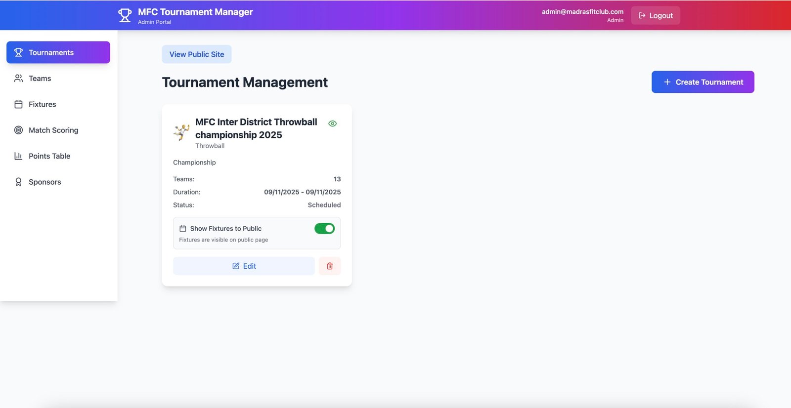 Tournament Manager Admin View
